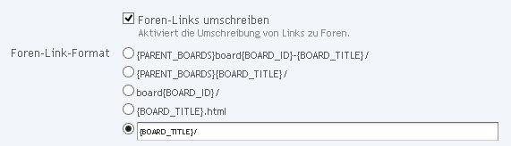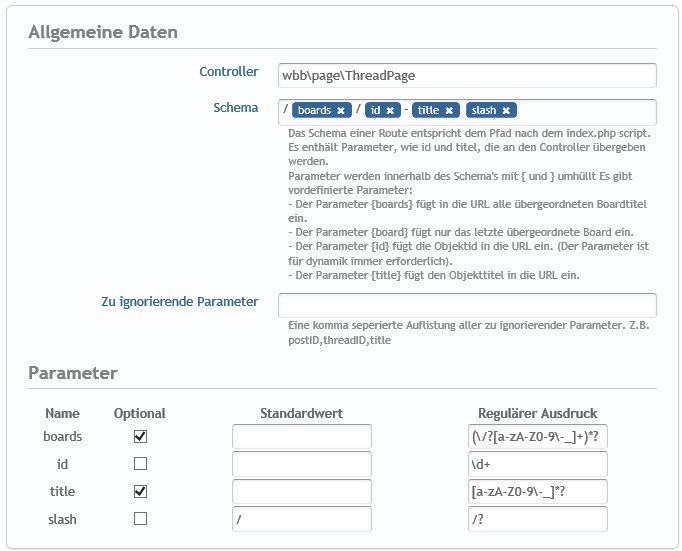 Warum das {slash} als Befehl und nicht als "/" stehen muss, weiss ich nicht. Auch nicht warum die optionalen Parameter angeklickt werden müssen und bei Slash der Standardwert und der reguläre Ausdruck angegeben werden soll. Wichtig ist aber z.b. das beim Threadroute die {id} drin stehen muss,- beim BoardRoute jedoch nicht zwingend. Jedenfalls ist es mir schliesslich gelungen die zumindests die sichtigen Links der Threads und Postings 1:1 auf dem WBB3 ins WBB4 zu tragen - auch alle internen Links funktionieren! ![]()