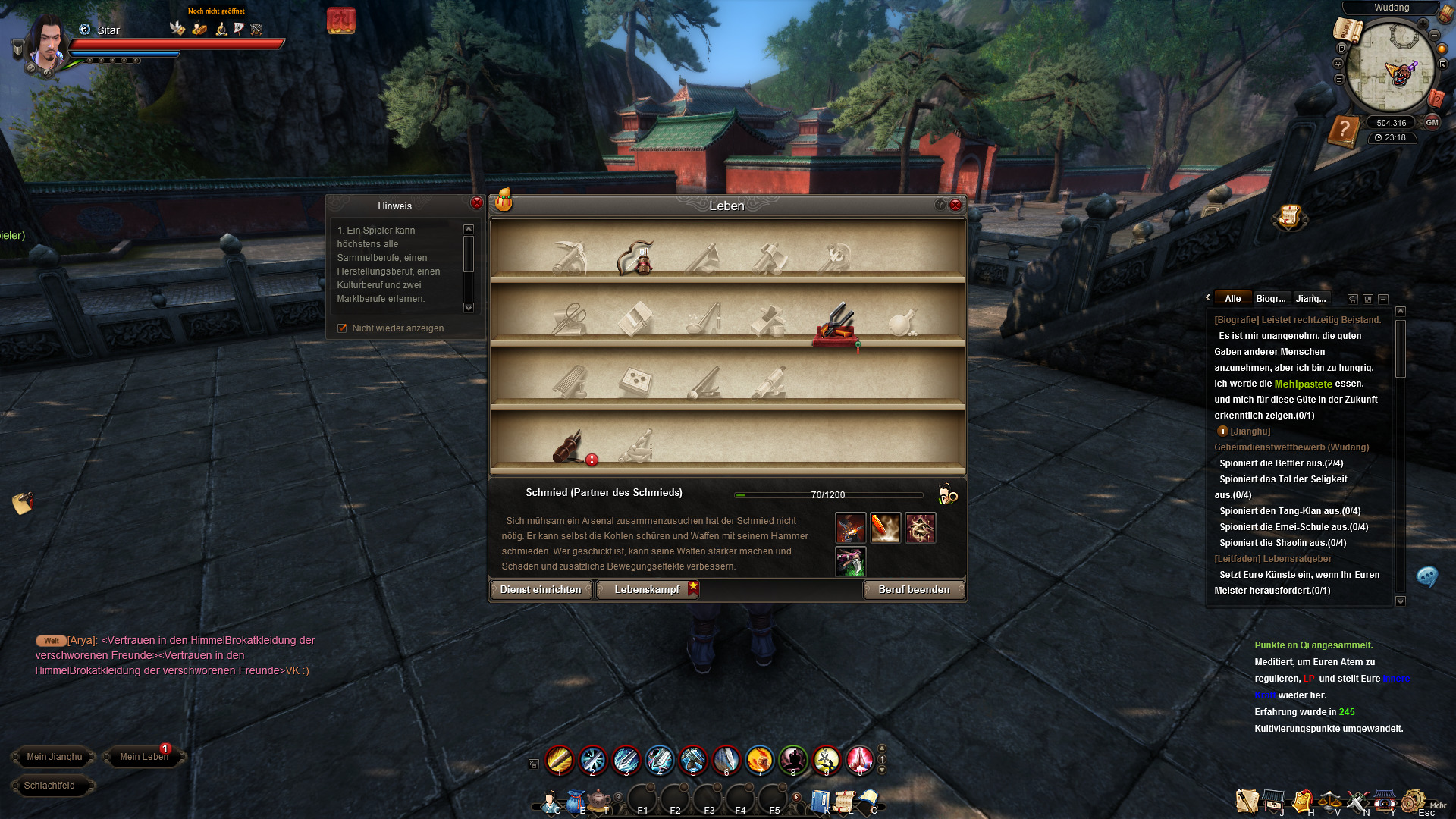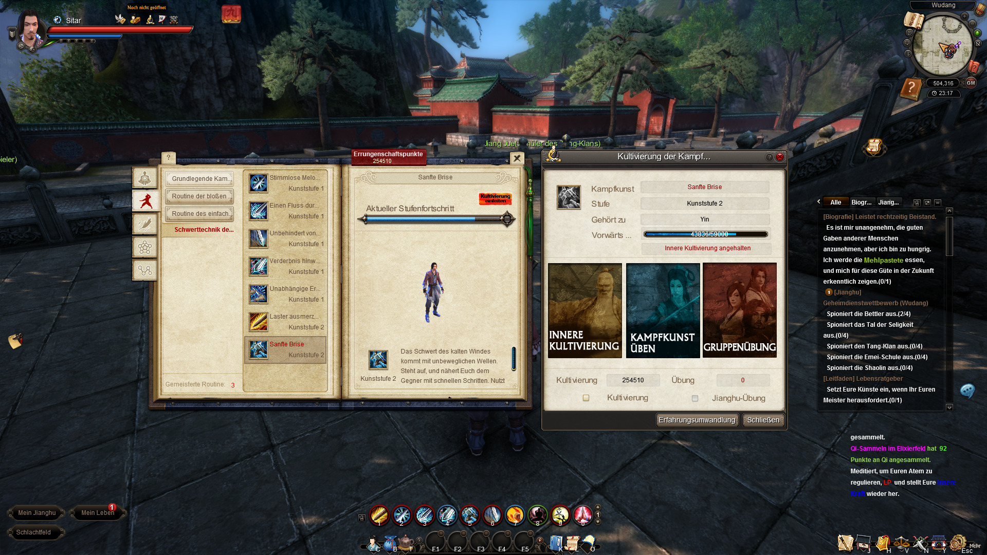 Wenn man in der Schule Quests absolviert bekommt man immer wieder Lehrbücher über die man seine Skills lernen kann. Manche Bücher, die man nicht über Quests bekommt, kann man auch an einem NPC kaufen. Hat man einen Skill einmal erlernt so kann man diesen verbessern. Das Ganze nennt sich Kultivierung. Hierbei werden Punkte, die ihr während des Spiels alle 120 Sekunden bekommt, eurem Kultivierungsprozess gutgeschrieben. In Age of Wulin kann man die Kultivierung auch über die Kampfkunst vorantreiben. Wieso das so heißt, weiß ich auch nicht wirklich da man hier die Kultivierung mit der ingame Währung Liang und Wen vorantreiben kann. Sprich man zahlt ingame dafür dass die Skills schneller erlernt werden. Es gibt auch noch Gruppenübungen um die Kultivierung voranzutreiben. Im Video habe ich das falsch erklärt. Man kann mit einer Gruppe mehrerer Spieler Übungen machen und so mit jeder Übung die Kultivierung beschleunigen.